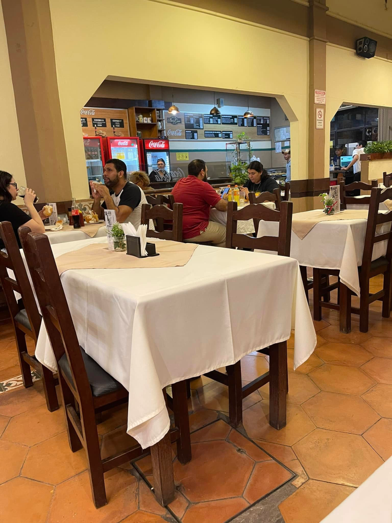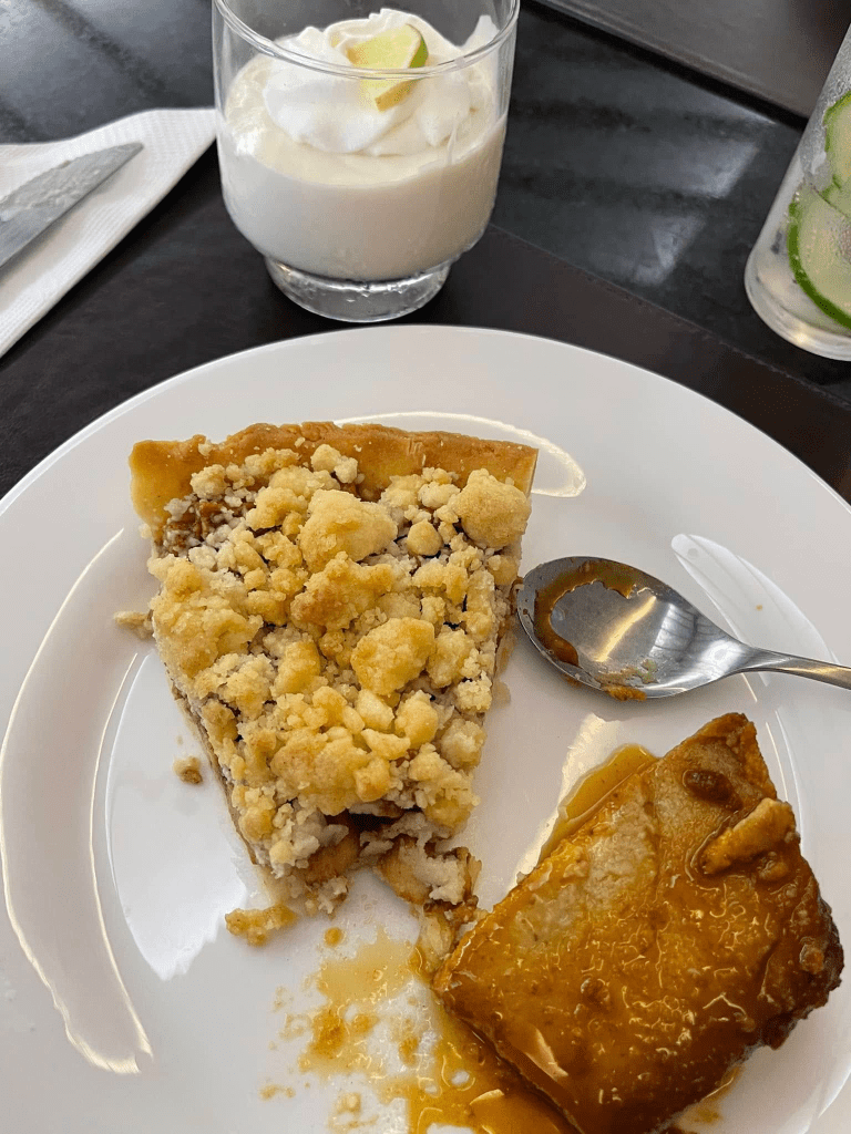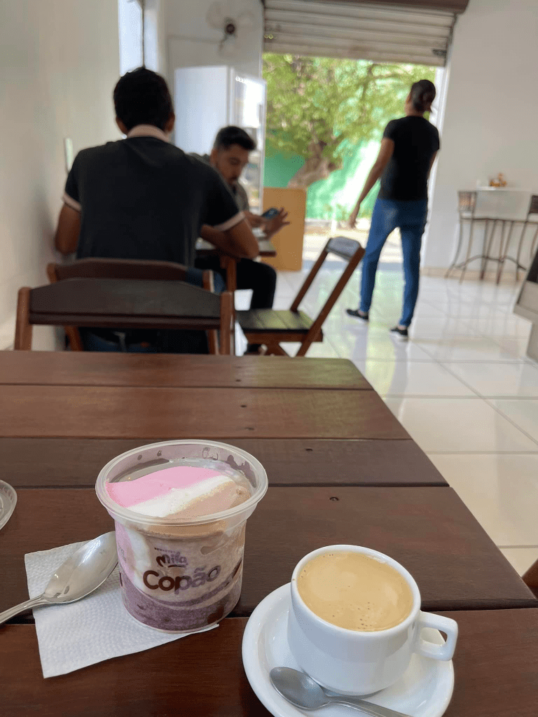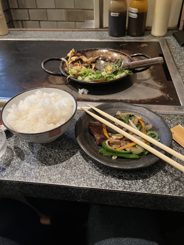 In a Japanese cafe. This is a dessert. Hot, sweet bean soup with fried dumplings and some indeterminate sweet balls, presumably made of rice since they were almost transparent. Green tea in the pot. Everything super delicately presented – and the service impeccable. It’s amazing how smoothly things flow in this country, even if it’s only in Japanese! Was it good? Sure, not too bad, but even more so it was fascinating.