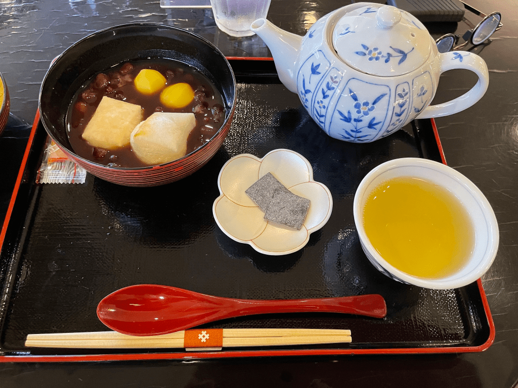 På japansk café. Dette er en dessert. Varm, søt bønnesuppe med friterte dumplings og noen ubestemmelige søte kuler, antagelig laget av ris siden de var nærmest gjennomsiktige. Grønn te i kannen. Alt super delikat presentert – og servicen upåklagelig. Det er utrolig hvor greit ting flyter i dette landet, selv om det kun er på japansk! Var det godt? Joda, ikke så verst, men enda mer var det fascinerende.