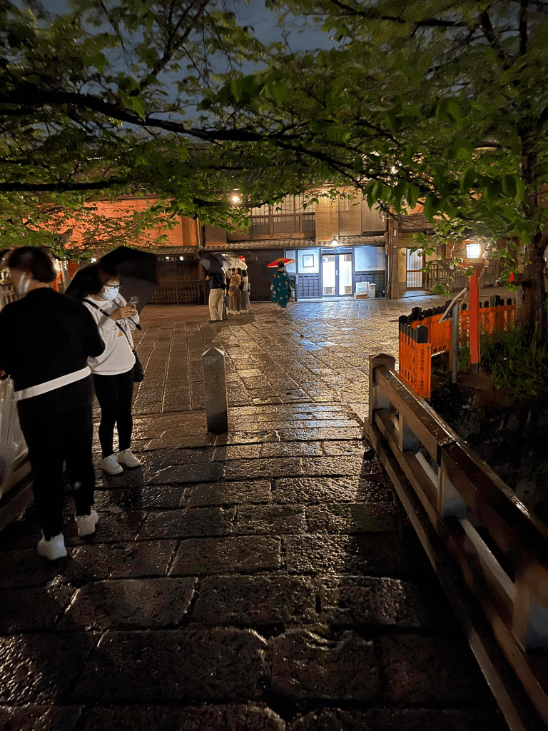 Jeg avslutter med et bilde fra Gion, nettopp fordi jeg fanget en ekte geisha midt i bildet. Hun trippet forbi mens vi stod i kø til restauranten. Hun skjulte ansiktet…