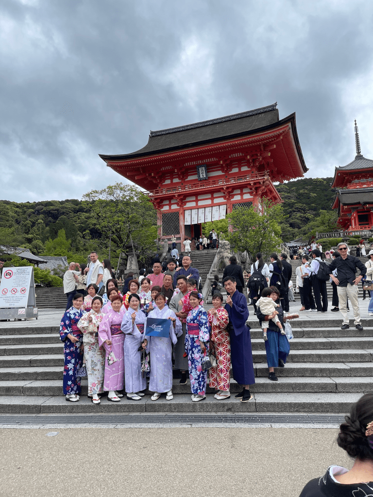 Her er vi kommet oss opp i den grønne åsen, til helligdommen Kiyomizu-dera, et kompleks av templer med praktfullt utsyn over byen. Mange har funnet veien opp hit denne mandagen! Er det slik at alle japanere går i kimono? Nei vi tror ikke det. Men nede i gaten som førte opp mot Kiyomizu-dera kunne man leie kimono! Det var overraskende mange som gjorde det, kanskje for å vise respekt mot helligdommen, eller kanskje bare for å få en sin selfie?